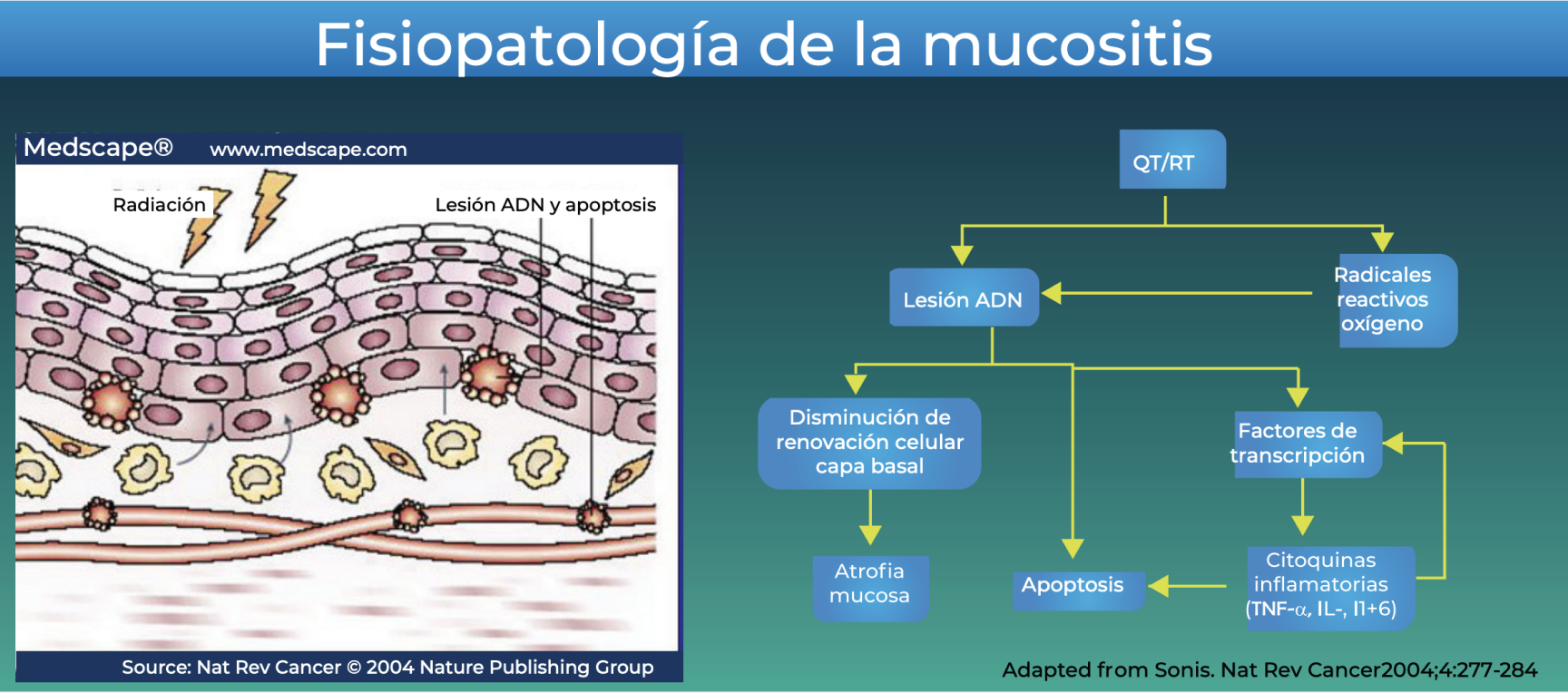 ¿Qué es la mucositis oral? La mucositis oral es un efecto secundario común de muchos medicamentos utilizados para tratar el cáncer (quimioterapia). También es frecuente entre pacientes que reciben radioterapia para el cáncer de boca, glándulas salivales, senos paranasales y garganta. La mucositis se produce cuando las células y los tejidos de la boca reciben lesiones debido al tratamiento contra el cáncer, que no puede distinguir entre células normales “buenas” o células cancerosas “malas”. Como resultado, el revestimiento de la boca se rompe y forma úlceras dolorosas. La gravedad de las úlceras bucales puede variar entre pacientes, y algunos pueden tolerarlas mejor que otros. Estas úlceras pueden tener lugar en cualquier parte de la boca, pero son más comunes en la lengua, el interior de las mejillas, los labios y el paladar blando (zona muy posterior de la boca). Aunque la mucositis puede ser dramática durante un periodo de tiempo mientras usted está en tratamiento, las úlceras casi siempre se curan por sí mismas tras unas pocas semanas de finalizar el tratamiento contra el cáncer. Sin embargo, debido al impacto negativo en la calidad de vida de los pacientes que la padecen, es importante tratar oportunamente la Mucositis Oral.