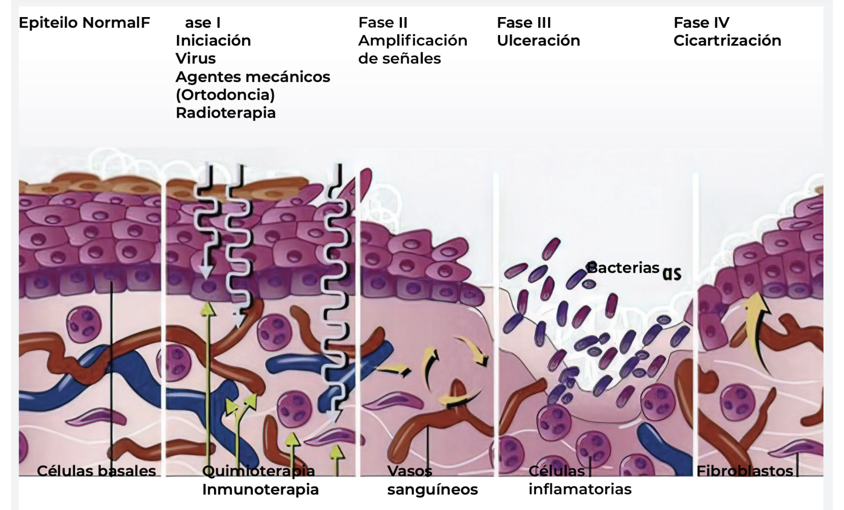 Eritematosa, Esta tipología aparece en los cinco o seis días posteriores a la quimioterapia. Además, si no existe evidencia de que exista infección, puede curarse por sí misma. En ciertos casos, aparece a los tres días y no dura más de diez o quince, cuando es consecuencia de la quimioterapia. Si aparece tras una radioterapia, su duración finalizará transcurridas seis u ocho semanas desde el tratamiento.